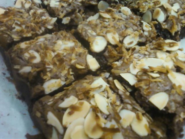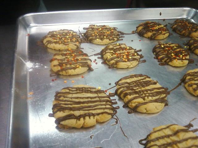 10am-ish Arrived at the Panache Kitchen and when I arrived, Jillian had the Almond Coconut Brownies done and she and Jacob, “adopted” son who helps at times, were putting the finishing touches on the Chocolate-drizzled Peanut Butter Cookies (decorated for fall).
