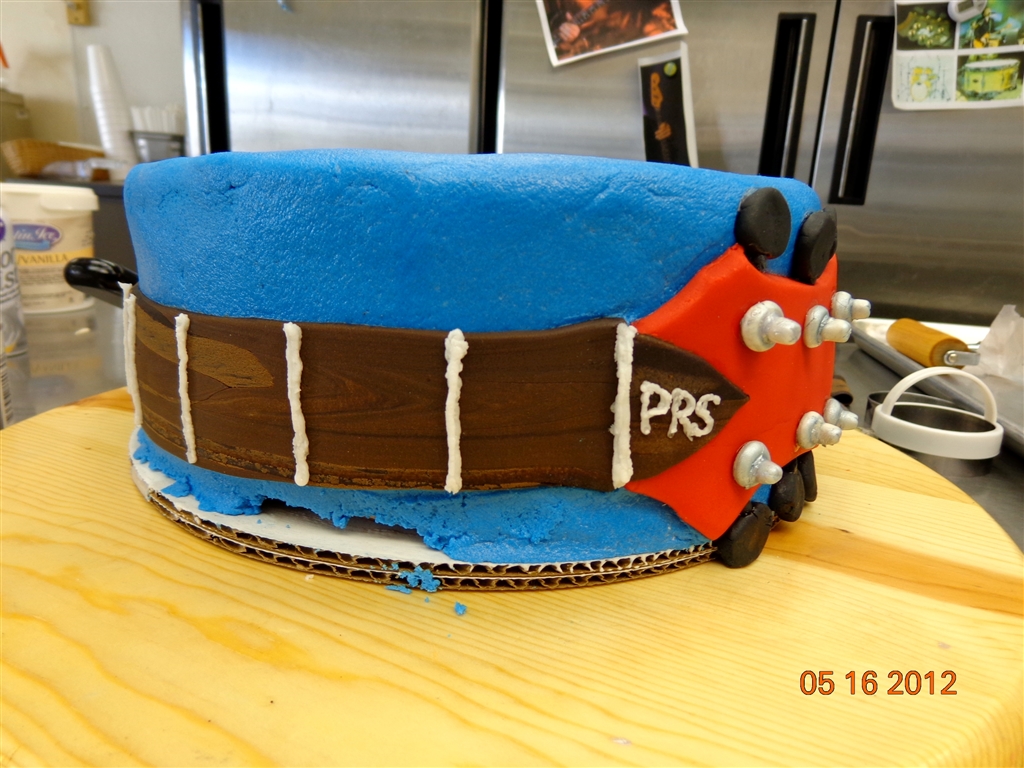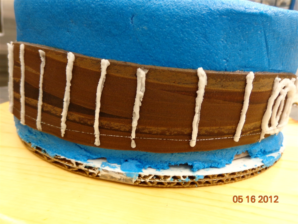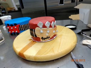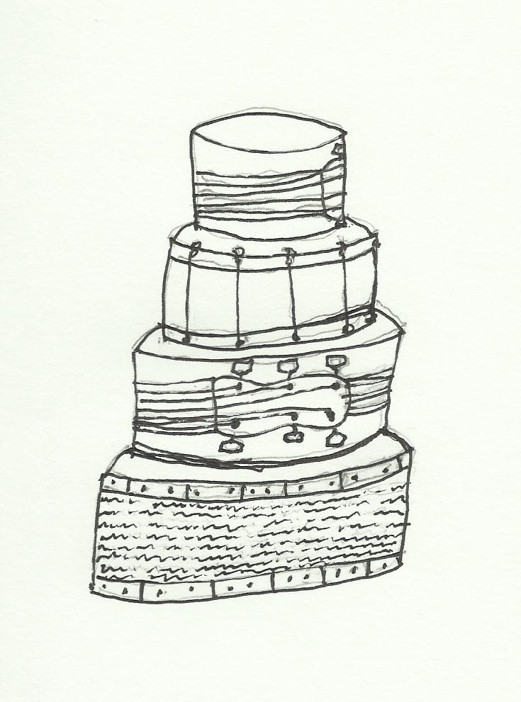 SO, when the Third Day Psycho Fans known as Gomers posted earlier this year that we would be taking a party to Raleigh, NC to celebrate the band’s 20 years, I jumped on the opportunity to make a special cake. A vision for the cake developed almost immediately; I knew the titles of all of their songs would make their appearance around the bottom layer of the cake. In order for the band to see a bit of themselves in the cake, it was a matter of getting their instruments on the cake. I saw one layer transformed into a drum then a bass head and neck wrapped around a layer and the same for a guitar around another.