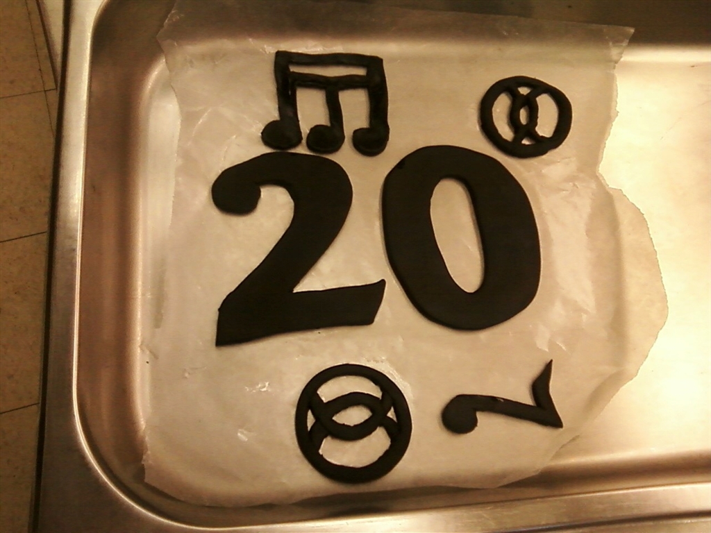 Later, I pictured fondant details including a 20 on top and, of course, the band’s name.