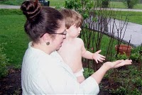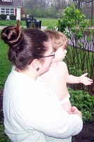 He said, “Wowow.” He stared and stared. SO, we went outside. I had Ben run to get the camera, this was too fun. We stuck our hands out in it then stood out in it. He giggled and blinked up into the rain until the thunder hit. He clung to me and pointed to the door pleading, “Side? Side?